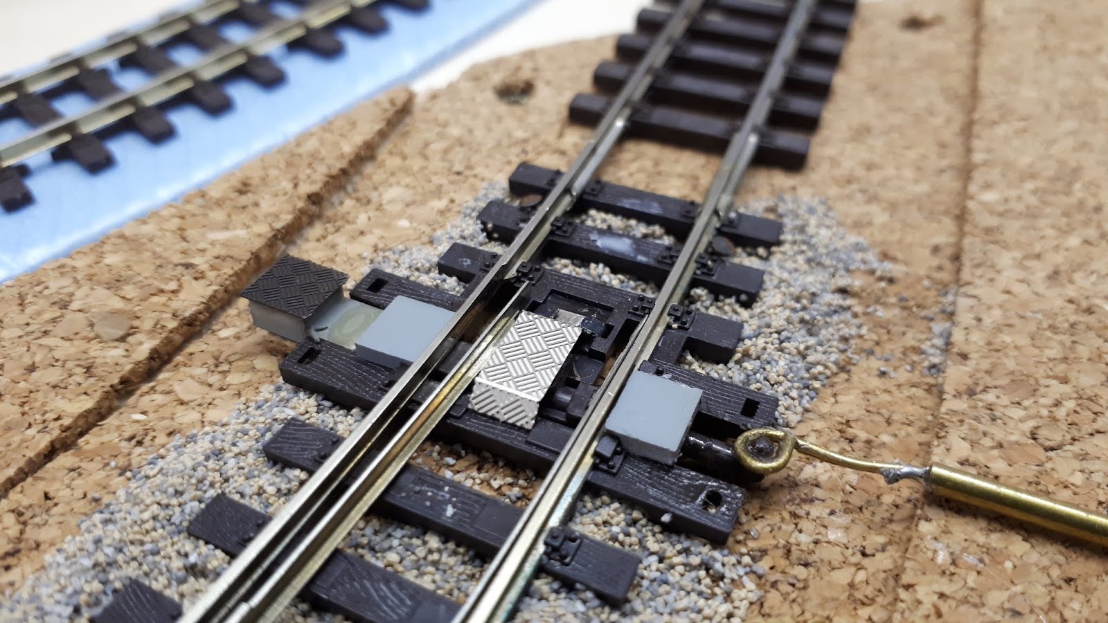 De twee wissels aan beide zijden van het station krijgen een motor wisselsteller, ook weer met een afdekplaat. Hierboven het meegebogen wissel in de tunnel, hieronder het zelfbouwwissel, vlak voor de andere tunnel.